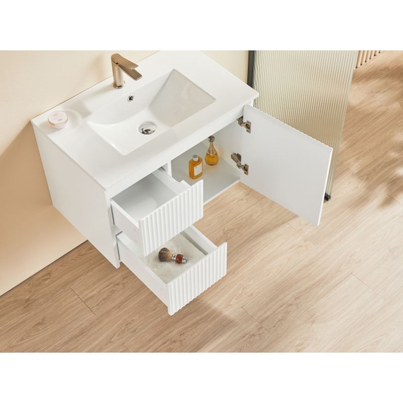 Wall-hung PVC cabinet with soft closing door and left hand drawers